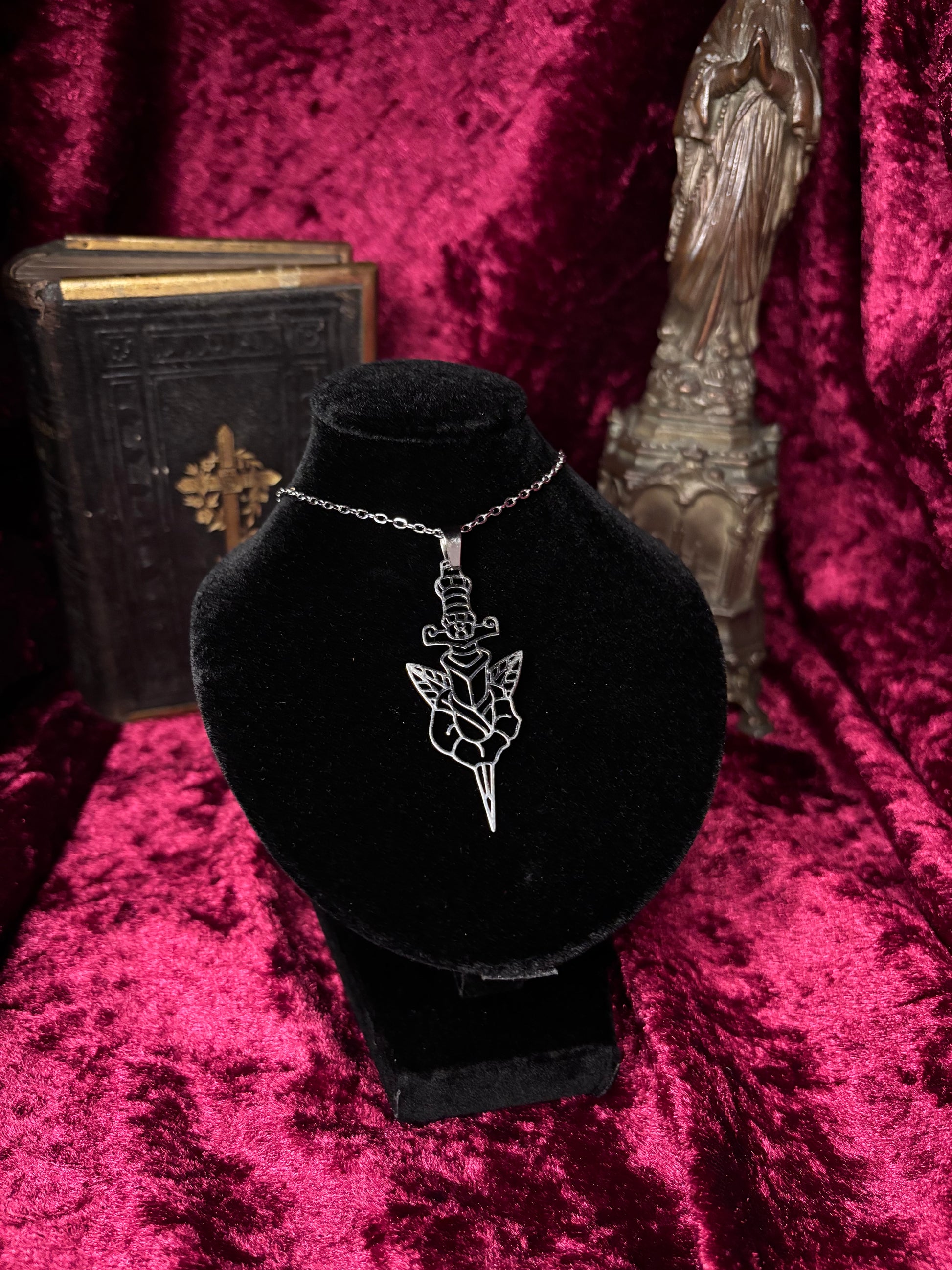 Accessorise in traditional style with the Mercy Necklace. Featuring a stainless steel tattoo-inspired rose and dagger pendant, choose from a trace or thick curb chain for a bold statement.